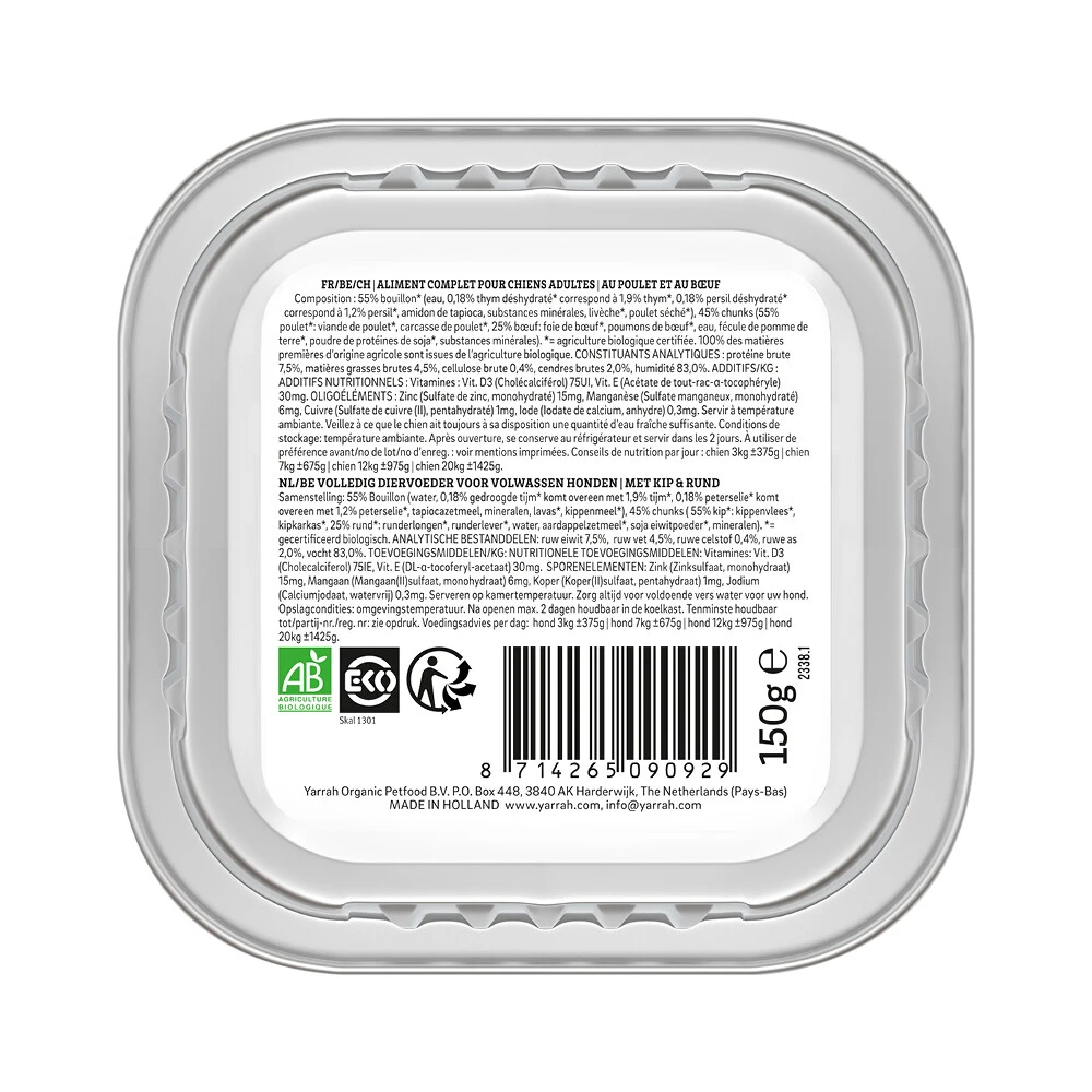 Yarrah Bio Hondenvoer Chunks Rund – KipGraanvrije chunks met biologische kip en rund, aangevuld met biologisch gecertificeerde tijm en peterselie. Geschikt voor alle honden, van puppy’s tot senior honden. Het biologische natvoer vormt een complete, voedzame en zeer smakelijke maaltijd voor je hond.Met biologische kip en rundTijm helpt bij ontstekingen, spijsverterings- en huidproblemen en artrosePeterselie verbetert de stofwisseling en de huid en vacht