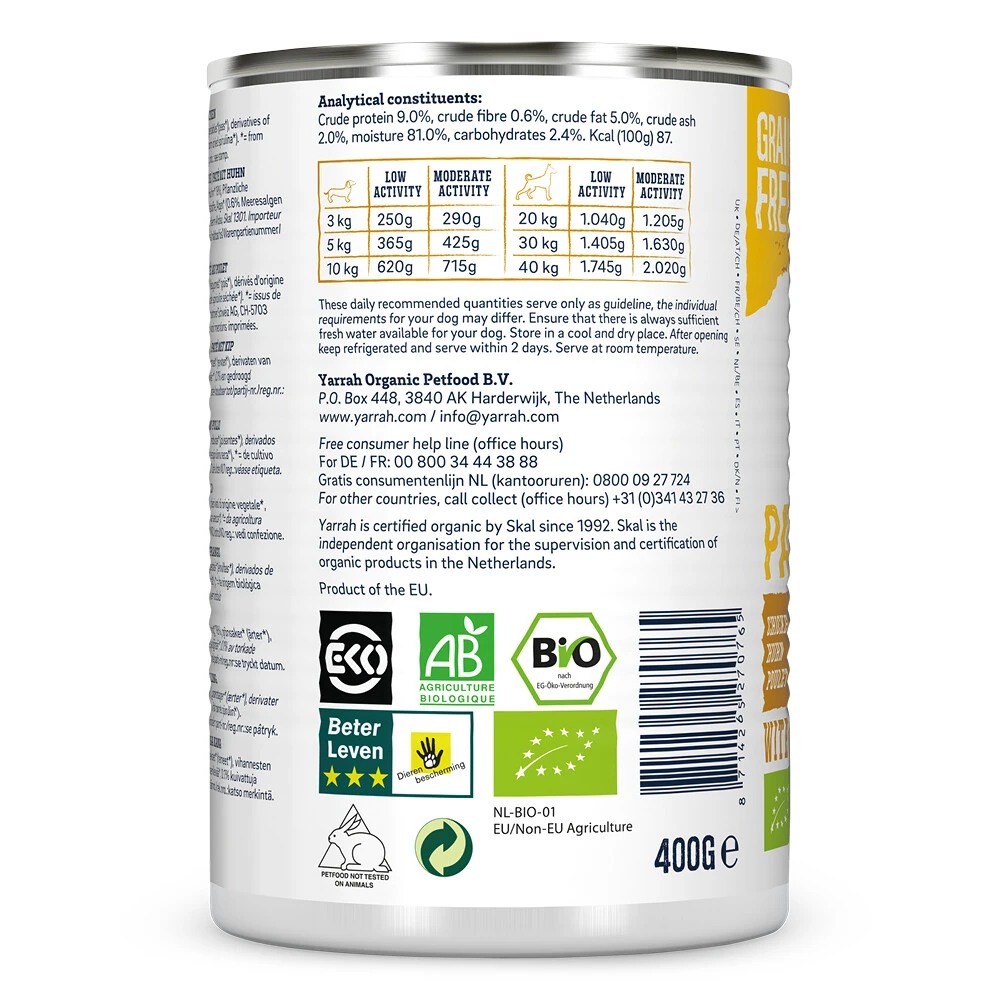 Yarrah Bio Hondenvoer Paté Kip Graanvrije paté met biologische kip, aangevuld met biologisch gecertificeerde spirulina en zeewier. Geschikt voor alle honden, van puppy’s tot senior honden. Het biologische natvoer vormt een complete, voedzame en zeer smakelijke maaltijd voor je hond.Met biologische kipSpirulina bevat vitamine B12, calcium, ijzer, zink, magnesium, kalium en aminozurenZeewier draagt bij aan een goede stoelgang, mooie vacht en soepele spieren