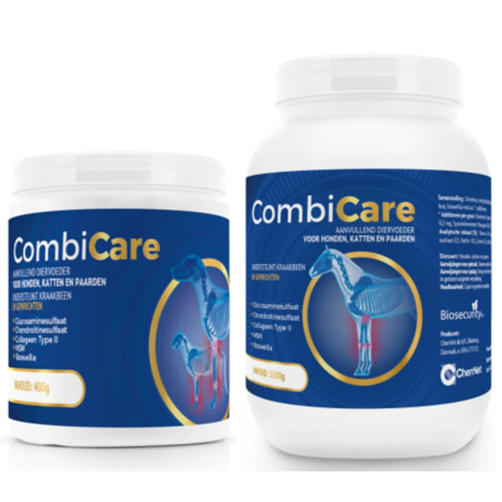 Combicare GewrichtsproblemenCombicare is een natuurlijk voedingssupplement voor een unieke bescherming van het kraakbeen en de gewrichten bij honden, katten en paarden.Combicare bevat naast Glucosamine, Chondroïtine en Collegeen type II het extract van de Indiaase boom, Boswellia Serrata. Dit extract wordt gebruikt om pijn in de gewrichten te verlichten.Combicare bevat ingrediënten die ondersteunen bij gewrichtsproblemen en overige bewegingsproblemen. Naarmate een hond, kat of paa