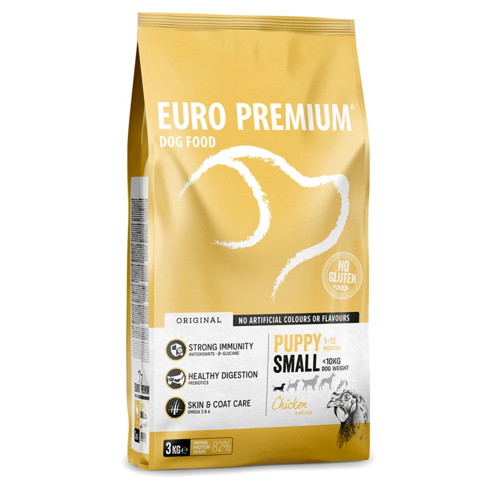 Euro-Premium Puppy Small Kip – Rijst Euro-Premium Puppy Small Kip – Rijst is een volledige, super-premium voeding voor opgroeiende honden van kleine rassen (1-12 maanden en tot 10kg volwassen gewicht). Deze energierijke voeding voor een optimale groei is tevens aanbevolen voor drachtige en zogende honden.Een optimale weerstand en een gezonde spijsvertering worden ondersteund door de toevoeging van een unieke blend van plantenextracten – rijk aan antioxidanten – aangevuld met prebiotica en &