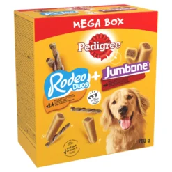 Pedigree Rodeo Jumbone MegaboxUltieme verwenbox voor je hond! Met maar liefst 24 Rodeo Duo Kip en Bacon en 4 Jumbone Rund en Gevogelte leg jij je hond de komende tijd helemaal in de watten. Een heerlijke afwisseling die de hond extra laat kwispelen.Pedigree Rodeo Duo Kip en Bacon is een heerlijke, getwiste verwensnack voor honden en is perfect als dagelijkse traktatie.Pedigree Jumbone Rund & Gevogelte is een heerlijke, vlezige kauwstaaf voor de hond, die lekker lang zijn smaak behoudt. Echt