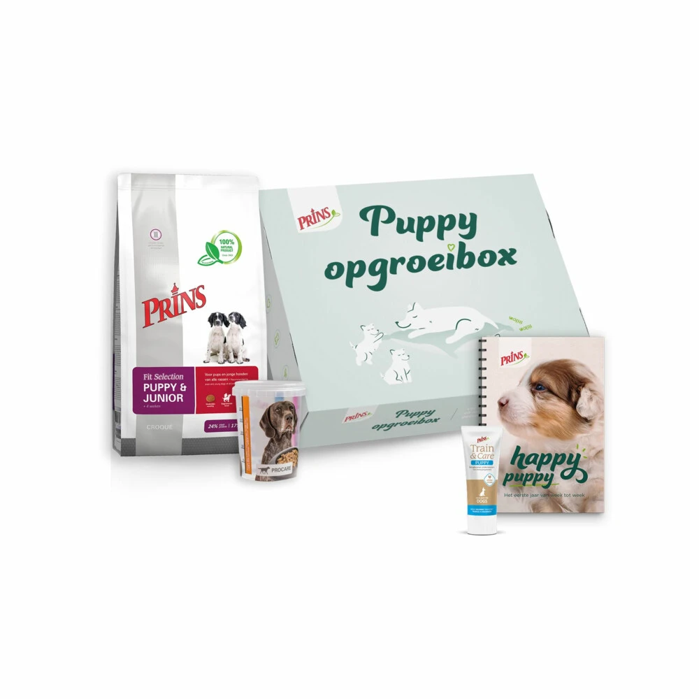 Prins Opgroeibox Fit Selection PuppyDeze leuke Prins Opgroeibox Fit Selection Pup is een leuke en smaakvolle manier om jouw pup een goede start te geven en kennis te maken met Prins! Deze leuke box bevat een zak Prins Fit Selection Puppy & Junior, een maatbeker, Train & Care Puppy beloningscrème en een handige puppykalender en groeimeter.Het droogvoer, Fit Selection Puppy & Junior, is speciaal ontwikkeld voor de opgroeiende familiehond en bevat alle bouwstoffen en energie die