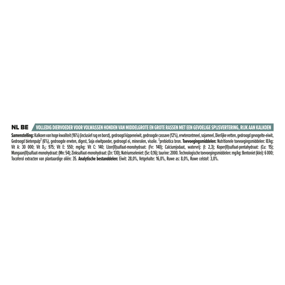 Pro Plan Adult Medium & Large Sensitive Digestion Graanvrij KalkoenGezonde graanvrije voeding voor volwassen honden. Speciaal afgestemd op zijn of haar behoeften (voorheen OptiDigest).Bevat Sensitive Digestion een specifieke mix van voedingsstoffen voor gezonde spijsverteringvoordelenBevat prebiotica waarvan klinisch bewezen is het aantal bifido bacteriën te vergroten voor een betere balans van de darmfloraGemakkelijk verteerbaar voor honden met een gevoelige spijsverteringMet specifiek