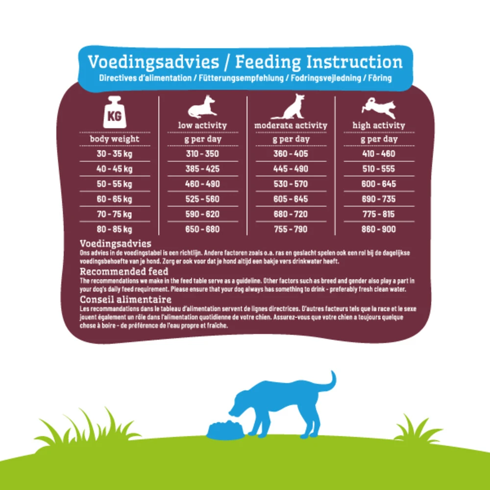 Smolke Hondenvoer Senior Maxi Smølke Senior Maxi is een complete Alles-in-één hondenvoeding afgestemd op de behoefte van grote oudere honden vanaf 6 jaar met een gewicht boven de 30kg. Het recept van deze lekkere en gezonde hondenbrokjes heeft als basis drie verschillende dierlijke eiwitbronnen, namelijk (verse) kip, duurzaam gevangen vis en lam. De voeding is samengesteld zonder tarwegluten en er zitten geen kunstmatige geur-, kleur- en smaakstoffen in. Smølke g