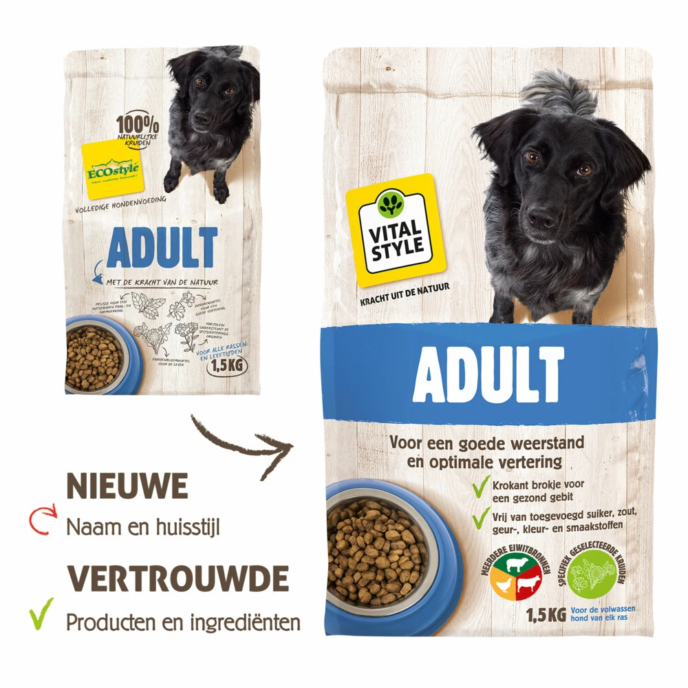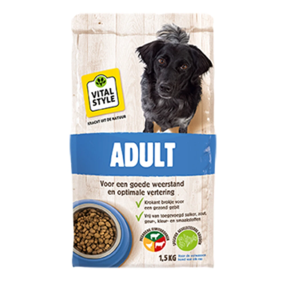 VITALstyle Hondenvoer Adult In adult hondenbrokken van VITALstyle (voorheen ECOstyle) zit alles wat je hond nodig heeft. De smakelijke brokjes met kruiden zijn krokant. Goed voor het gebit en een actieve spijsvertering.In VITALstyle Hondenvoer Adult zitten veel verschillende ingrediënten: meerdere soorten vlees (diverse, goed verteerbare eiwitbronnen), granen en andere natuurlijke grondstoffen. Dat doen we bewust. Het daagt de spijsvertering van je hond uit en zorgt voor een goede