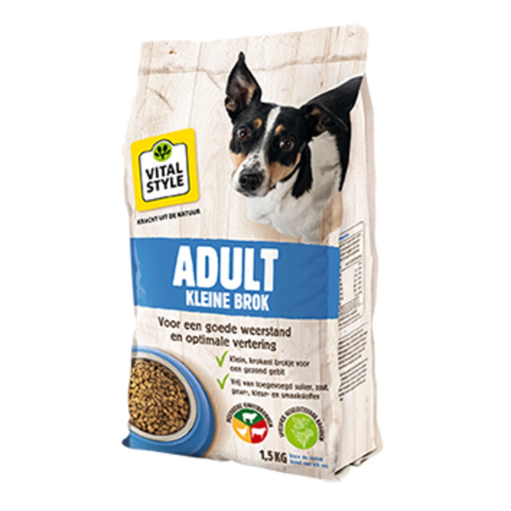 VITALstyle Hondenvoer Adult Kleine HondIn VITALstyle (voorheen ECOstyle) adult kleine hondenbrokken zit alles wat je hond nodig heeft. De smakelijke brokjes met kruiden zijn krokant. Goed voor het gebit en een actieve spijsvertering.In het voer zitten veel verschillende ingrediënten: meerdere soorten vlees (diverse, goed verteerbare eiwitbronnen), granen en andere natuurlijke grondstoffen. Dat doen we bewust. Het daagt de spijsvertering van je hond uit en zorgt voor een goede vertering. Er