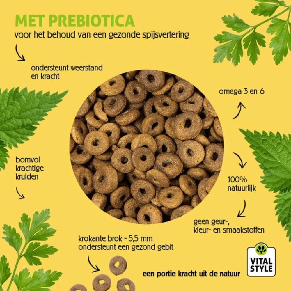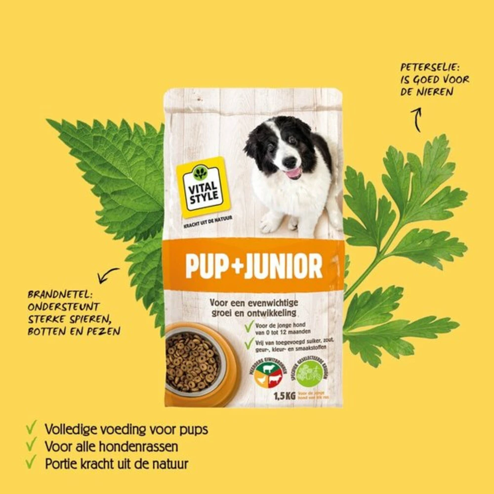 VITALstyle Hondenvoer Puppy – JuniorMet de VITALstyle Hondenvoer voor puppyu0027s en jonge honden zorg je voor een verantwoorde dagelijkse voeding voor jouw hond. Deze brokken bevatten een breed scala aan ingrediënten; meerdere soorten vlees (diverse, goed verteerbare eiwitbronnen), granen en andere natuurlijke grondstoffen. De 100% natuurlijke voeding bevat geen geur-, kleur-, smaakstoffen of conserveringsmiddelen en is daarnaast vrij van toegevoegde suikers en zouten. Stimuleert gez