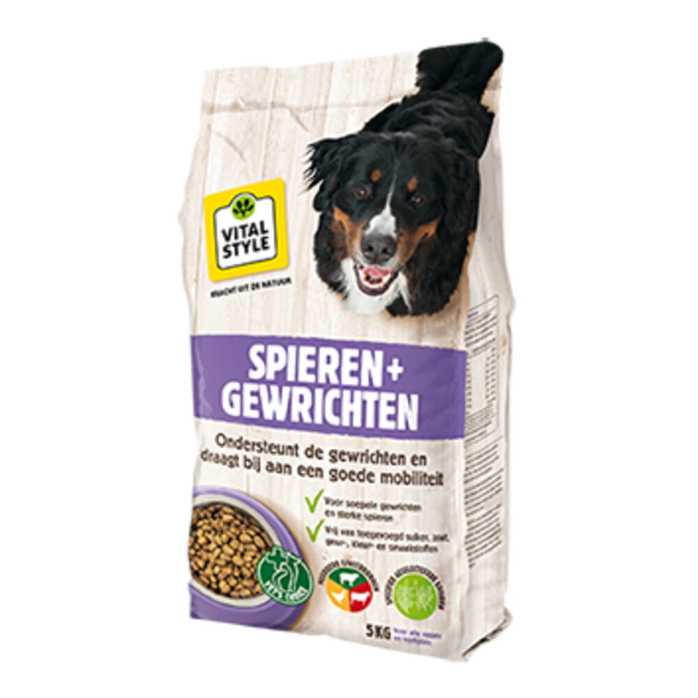 VITALstyle Hondenvoer Spieren & GewrichtenVITALstyle (voorheen ECOstyle) spieren en gewrichten hondenbrokkenDe ingrediënten in spieren en gewrichten ondersteunen de gezondheid van de gewrichten bij slijtage (osteoartritis) en dragen bij aan de opbouw van kraakbeen. Extra zalmolie met hoge concentraties omega-3 vetzuren (EPA en DHA), speciale kruidenextracten, waaronder Boswellia, Paardenbloemwortel en Wilgenbast, maar ook bèta-glucanen en gelatinehydrolisaat (collageeneiwit) help