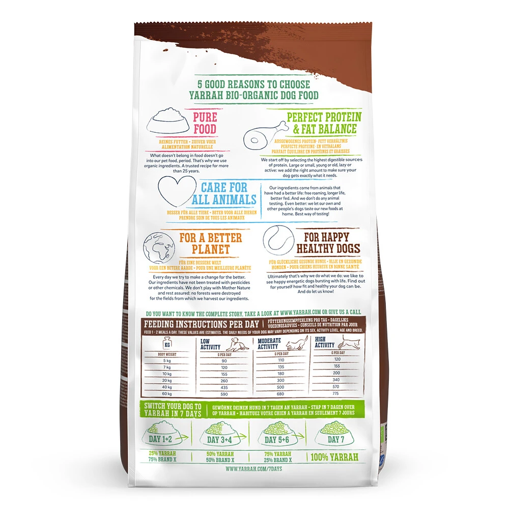 Yarrah Bio Hondenvoer Senior Kip Overheerlijke brokken met biologische kip, MSC-vis, biologische duivelsklauw, heermoes en rozenbottel voor honden van 7 jaar en ouder. Het biologische hondenvoer vormt een complete, voedzame en zeer smakelijke maaltijd voor je oudere hond. Zuiver biologisch voer en dus vrij van chemische geur-, kleur- en smaakstoffen, pesticiden en GMO, waarbij de best opneembare eiwitten zijn geselecteerd. Zo krijgt je hond precies binnen wat hij nodig heeft.Deze zak bevat